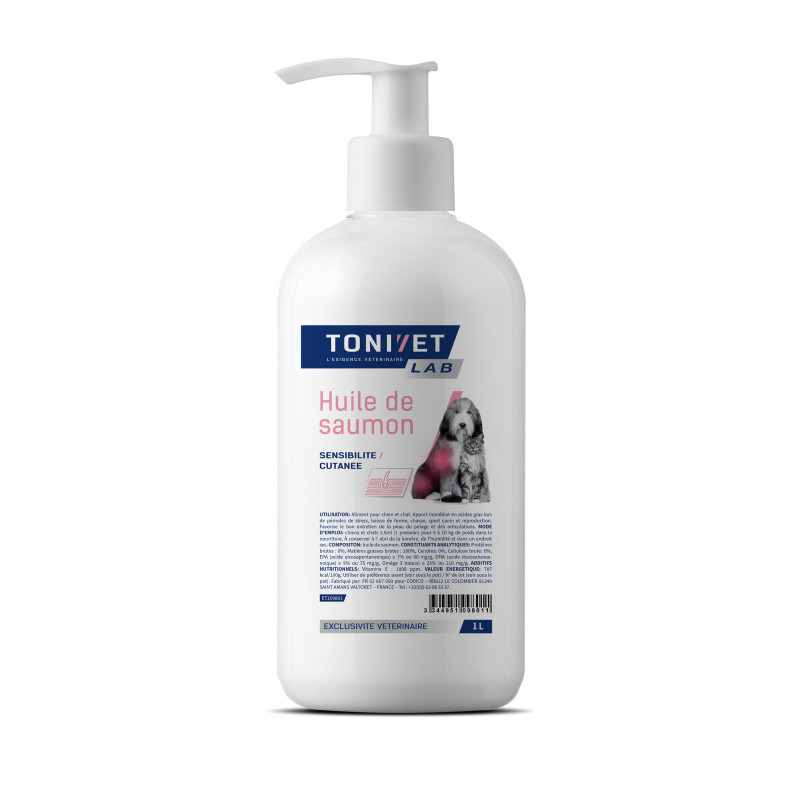 L’huile de Saumon pour chien TONIVET est un complément nutritionnel adapté aux chiens de tout âge. Elle permet un apport immédiat en acides gras lors de périodes de stress, baisse de forme, chasse, sport canin et reproduction. Elle favorise le bon entretien de la peau, du pelage et des articulations. Son flacon pompe la rend très pratique à utiliser.