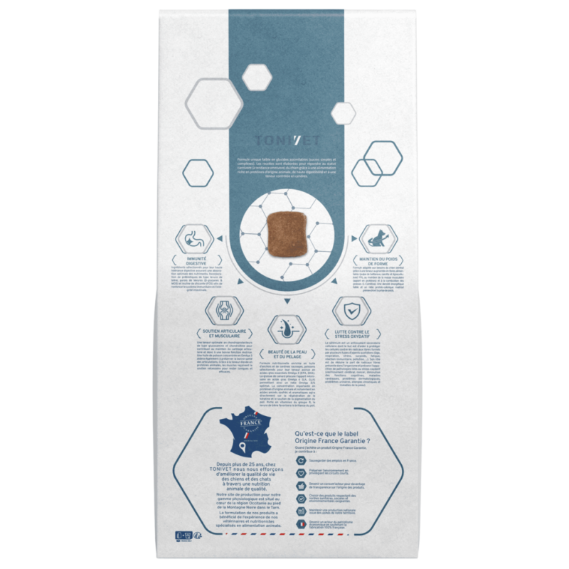 TONIVET ADULTE MAXI STERILISE aide à maintenir un poids de forme optimal chez les chiens stérilisés de grande taille grâce à une teneur élevée en protéines (33%), un apport modéré en matières grasses (12%) et un rationnement contrôlé. La richesse en fibres de ce produit favorise le transit et apporte une sensation de satiété. La présence de chondroprotecteurs favorise le soutien articulaire.