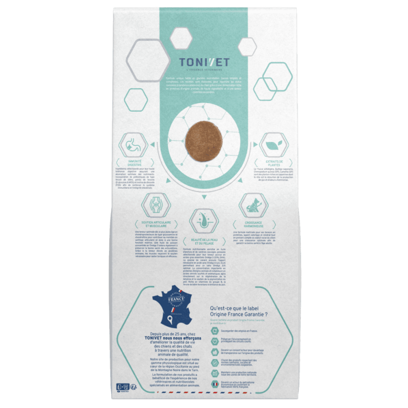 TONIVET JUNIOR MINI apporte tous les nutriments nécessaires à la croissance du chiot de petite taille, grâce à un apport énergétique optimal et une taille de croquette adaptée à leur morphologie. Il contribue à une digestion optimale et aide au bon équilibre de la flore intestinale. Cet aliment convient à la chienne en gestation ou en lactation.