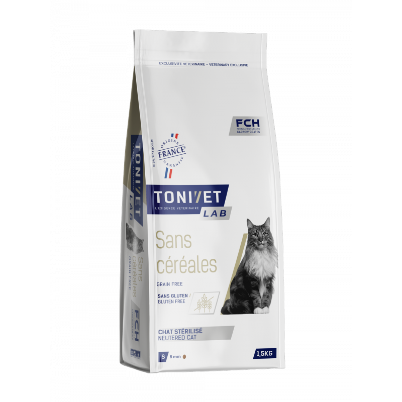 TONIVET CHAT ADULTE SANS CEREALES possède une formule spécifique pour répondre aux besoins des chats adultes sensibles aux céréales et au gluten. Son taux élevé de protéines d’origine animale de haute qualité 81% (poulet, truite, saumon, œuf) combiné à des sources alternatives de glucides en font un aliment hautement digestible. Il contient une sélection de plantes détoxifiantes, de la levure de bière (vit B), de graines et huile de poisson riches en acides gras essentiels favorisant la bonne santé de la peau et du pelage. Il apporte également un soutien articulaire (glucosamine, chondroïtine) et urinaire (artichaut, chélateurs, apport minéral contrôlé).