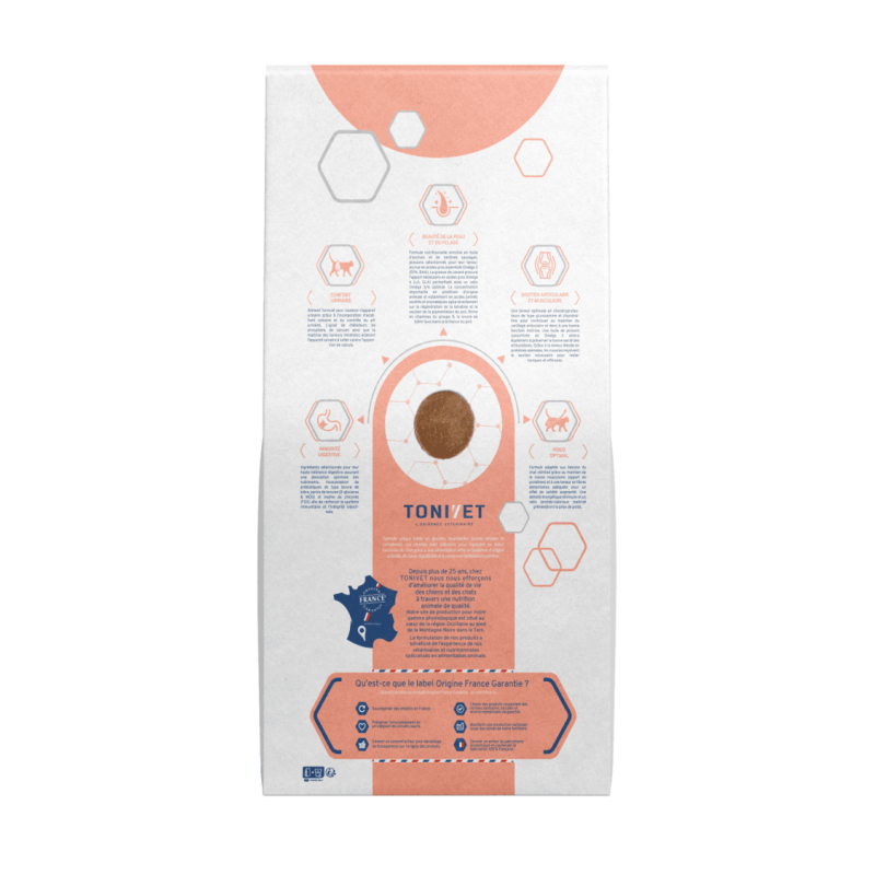 TONIVET CHAT ADULTE STÉRILISÉ SAUMON apporte tous les nutriments nécessaires au chat adulte grâce à un apport énergétique - protéique optimal et possède une taille adaptée à leur morphologie. Il contribue à une digestion optimale et aide au bon équilibre de la flore intestinale. Il favorisera le soutien articulaire (glucosamine, chondroïtine, oméga 3), le pelage brillant (acides aminés soufrés) et le confort urinaire (artichaut, chélateurs, apport minéral contrôlé). Répond aux besoins du chat stérilisé.