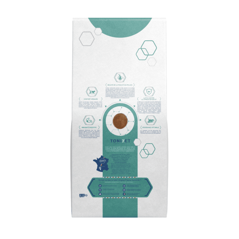 TONIVET CHATON apporte tous les nutriments nécessaires à la croissance du chaton grâce à un apport énergétique - protéique optimal et possède une taille adaptée à leur morphologie. Il contribue à une digestion optimale et aide au bon équilibre de la flore intestinale. Dès le plus jeune âge il favorisera le soutien articulaire (glucosamine, chondroïtine, oméga 3), le pelage brillant (acides aminés soufrés) et le confort urinaire (artichaut, chélateurs, apport minéral contrôlé). Cet aliment convient parfaitement à la chatte en gestation ou en lactation. Répond aux besoins du chat stérilisé.